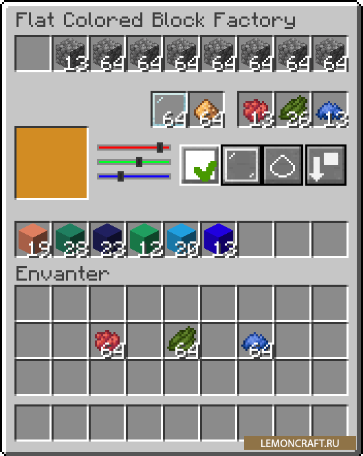Мод на цветные блоки из булыжника Modern Flat Colored Blocks является продвинутой версией мода FCB, которая позволит вам с помощью специального верстака, создать блоки из булыжника в различных цветовых решениях. При создании блока вы полностью контролируете сам цвет, а так же можете указать, будет ли данный блок источником света.